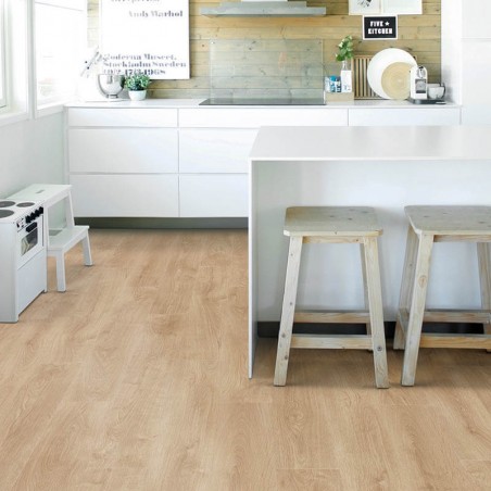 Revêtement de sol super rigide, décoratif, disponible en lame ou en dalle, constitué d'une couche d'usure de 0,30 mm, d'une sous-couche 1,00mm pour une épaisseur totale de 5,50 mm. Il ne craint pas l'eau et résiste aux températures extrême (de -10° +60°). Il offre également une correction acoustique optimale. Des veinages marqués et tourmentés par de petits n?uds donnent un aspect cosy mais net à ce revêtement de sol effet chêne adapté aux intérieurs modernes.