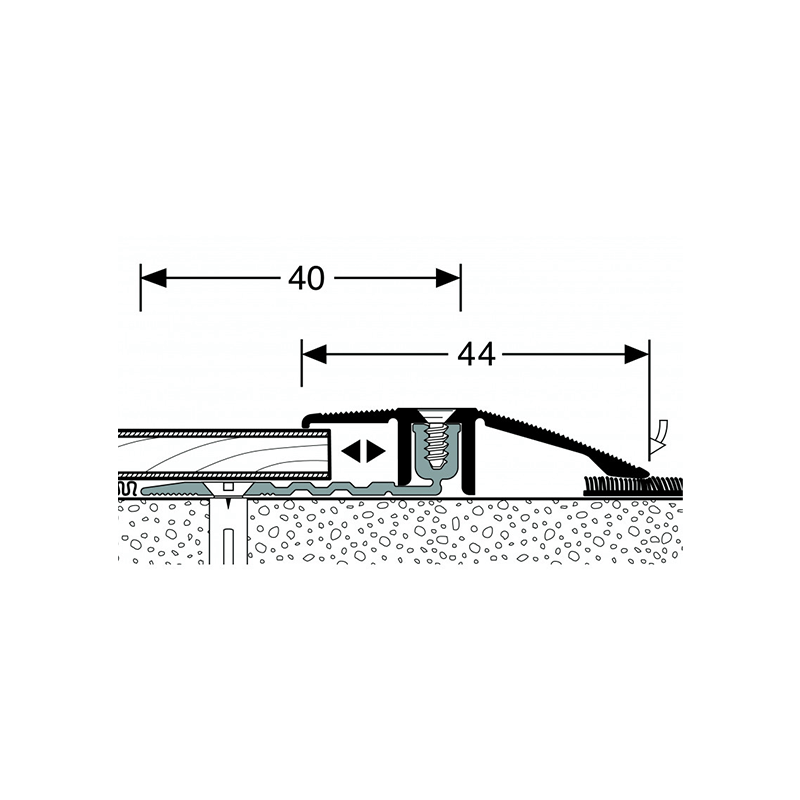 Positionner la base du profilé en respectant un espace pour dilatation. Repérer les trous et percer dans la chape. Placer les chevilles, visser la base. Visser le chapeau sur la base pour assurer une bonne jonction. Pour visser la base, pour visser le chapeau sur la base, utiliser les vis de même couleur livrées avec le profilé.