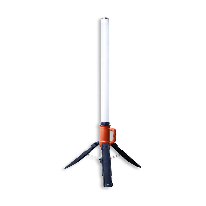 La poignée facilite le transport. Le trépied pliable avec verrouillage par bague de serrage assure une mise en place rapide et sûre. L'alimentation secteur et le câble HO7RN-F 2G 1,5 mm2 de 4 m garantissent une installation simple sur site.