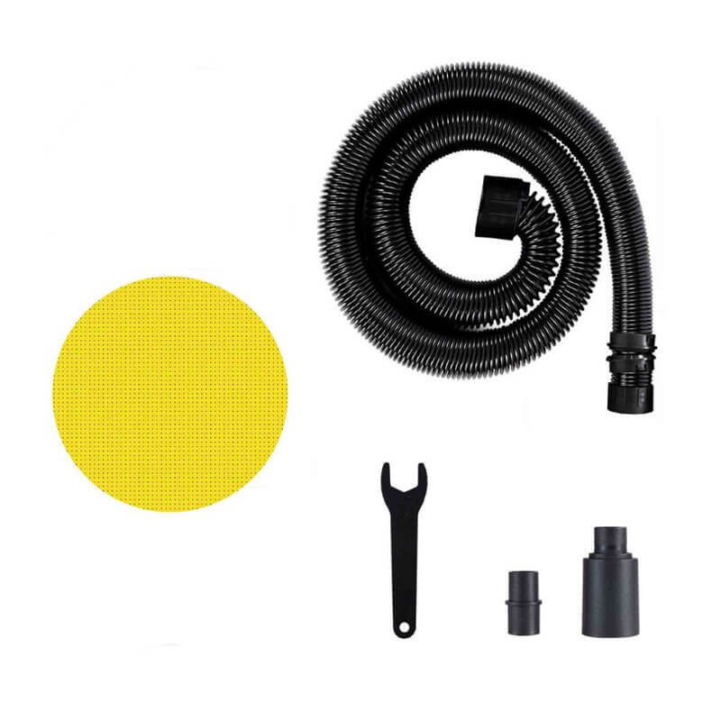 Accessoires inclus : disque de ponçage, tuyau d'aspiration, 2 connecteurs, manuel d'utilisation