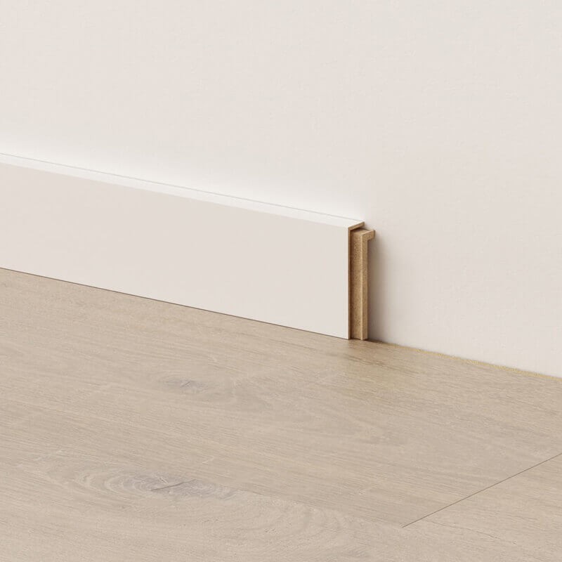 Avec sa hauteur de 50 mm, la plinthe SFSKCLICKWHITE240 s'adapte parfaitement aux piècesétroites, aux bas de murs ou aux zones à faible hauteur de mobilier. Discrète et raffinée, elle assure une transition fluide entre le sol et le mur tout en protégeant efficacement contre les chocs et la poussière.