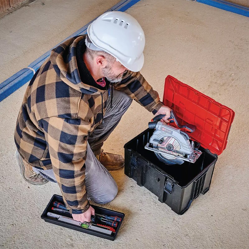 Avec une hauteur intérieure de 25 cm, la mallette E-Case M est idéale pour le rangement d'outils électroportatifs de grande taille, tels que les scies circulaires portatives, les marteaux perforateurs ou les rabots sans fil Einhell.