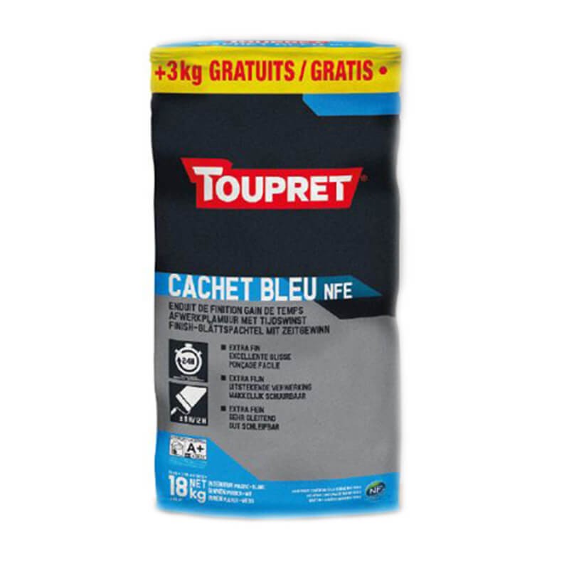 Toupret Cachet Bleu est un enduit de finition gain de temps en poudre, intérieur, pour application manuelle. Toupret Cachet Bleu s'applique sur supports neufs ou rénoves, bruts ou peints et est recouvrable par tous types d'enduits, peintures et revêtements muraux. Toupret Cachet Bleu est idéal en ratissage et bouchage-porage avec une excellente glisse sans surépaisseur et sans arrachement. Il a un haut pouvoir couvrant.