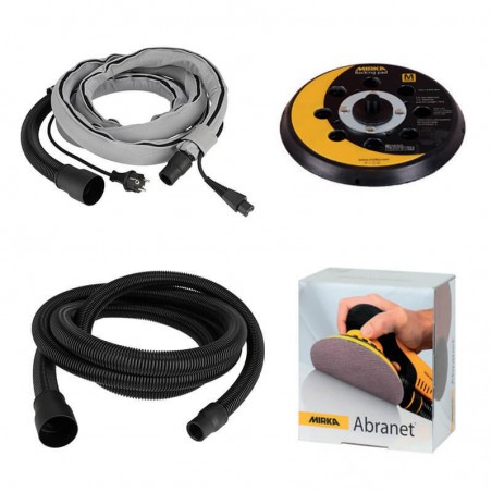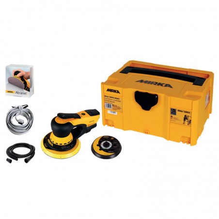 Pack composé d'un ponceuse Mirka deros 5650cv, d'un coffret de rangement, d'un tuyau de 4m, d'une gaine de protection, d'un capot protecteur de plateau "Edge Protecteur" et de 100 disques Abranet diamètre 150mm (P120 & P180)