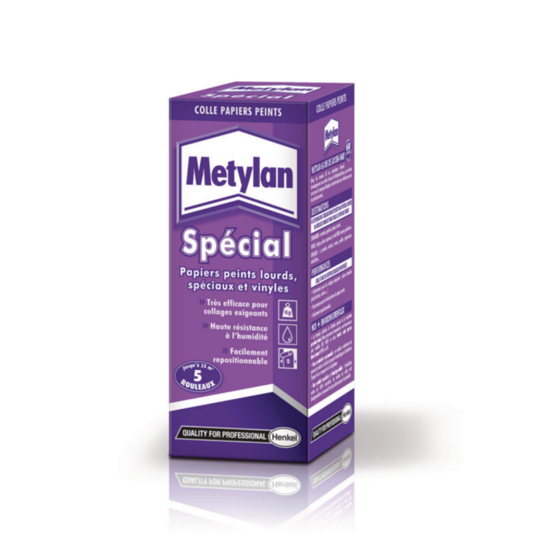 La colle Metylan Spécial s'utilise pour la pose de papier d'apprêt, à peindre, ingrain, dupleix lourd, papiers peints spéciaux (velours, floqués métallisés, pailleux, japonais, mica), papiers peints vinyles plats, liège à envers papier.