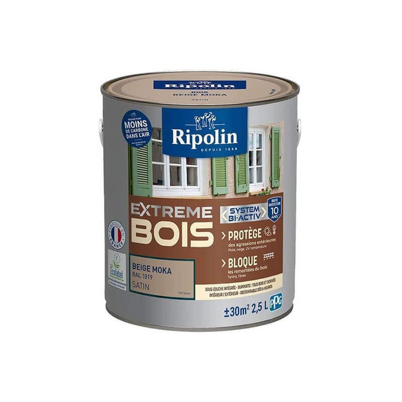 La Peinture Extrême Satin Ripolin offre une protection longue durée contre les agressions climatiques et les variations du bois. Certifiée A+ et Ecolabel, elle garantit performance, durabilité et respect de l'environnement. Idéale pour portes, volets, bardages et menuiseries extérieures.