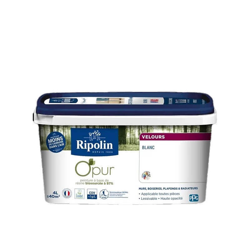 La Peinture O'Pur Multisupport Velours Ripolin est une peinture à base de 97 % de résine biosourcée qui allie performance, esthétisme et respect de la santé. Conçue pour préserver la qualité de l'air intérieur, elle est certifiée Ecolabel et recommandée par l'AFPRAL pour limiter les risques d'allergies respiratoires. Parfaite pour les murs, boiseries et radiateurs, elle assure une finition velours douce et élégante.