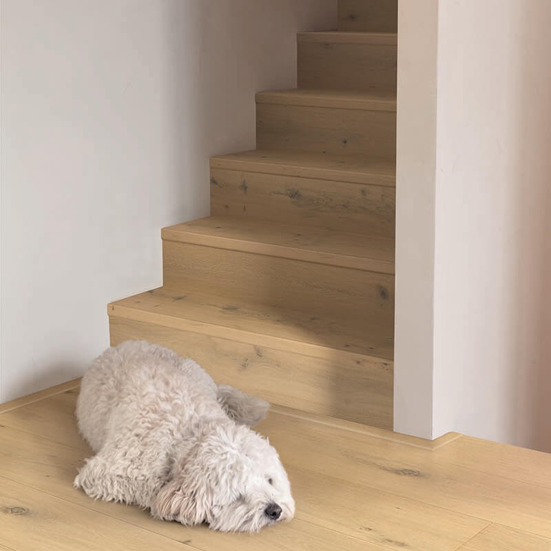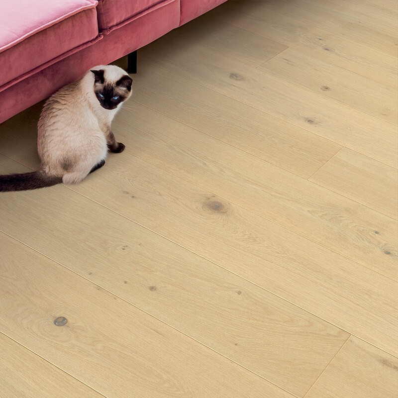 Surface facile à nettoyer : Votre sol n'aura jamais l'air sale ou sombre. Grâce à un système de revêtement unique qui couvre toute la surface, même dans les textures les plus profondes. La saleté n'adhère pas au bois !
