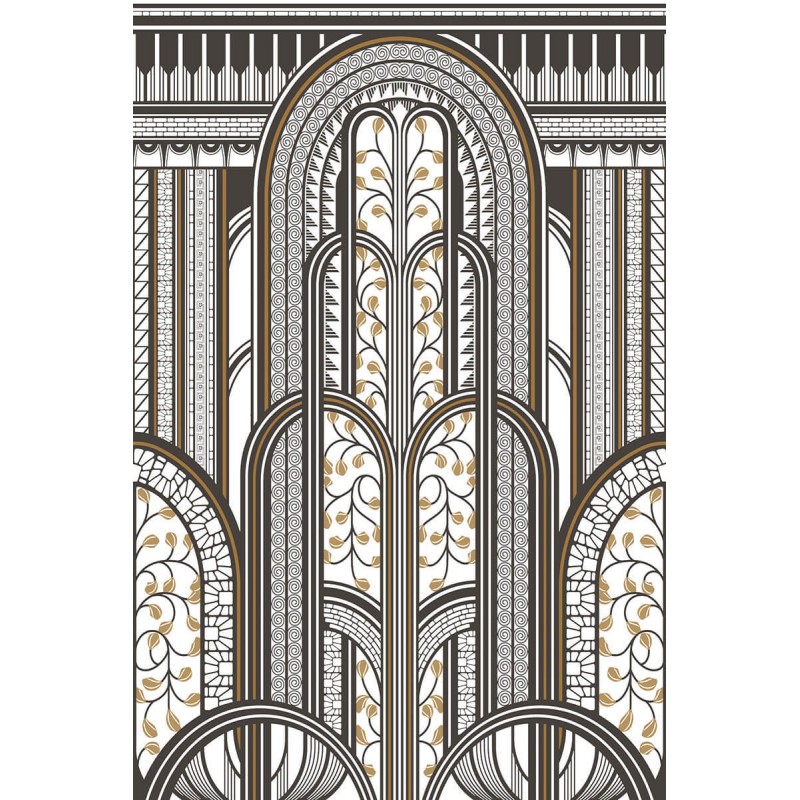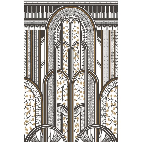Extraordinaire décor panoramique pour habiller un pan de mur avec beaucoup de faste. Raccordable, celui-ci peut également couvrir une surface plus large. Le dessin rend hommage aux somptueux paravents Art Déco des années 30 par ses courbes géométriques et ses motifs végétaux hyper travaillés aux reflets métalliques.