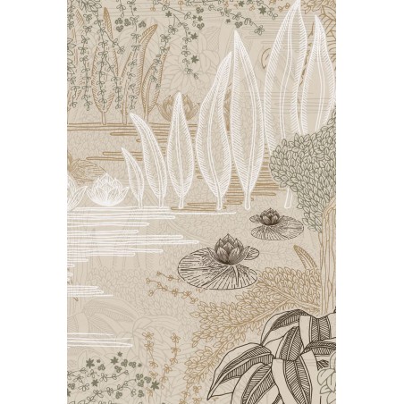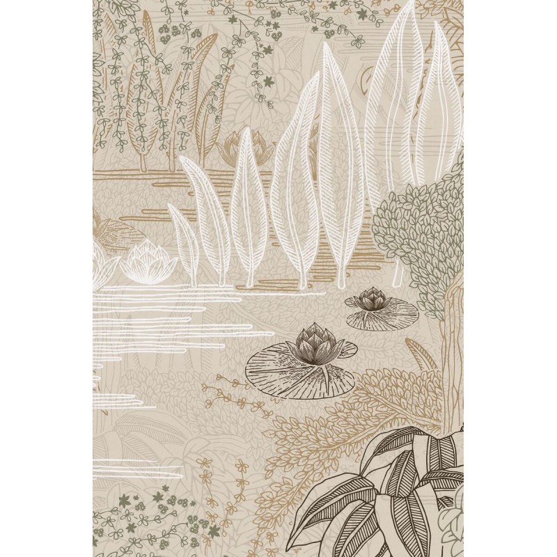 Papier peint Casamance Square jasmin jasmin grege/vert argile 75680100 La collection s'ouvre sur un jardin au graphisme raffiné, apaisé par la présence de l'eau. Ce jardin est une évocation d'un petit hôtel particulier parisien, conçu en 1922 par l'architecte Hector Guimard au 3, Square Jasmin. Métaphore du langage végétal de l'architecte, qui emploie des formes ornementales inspirées par la nature, Jasmin dépeint une ?uvre d'une extrême finesse. L'influence de l'art japonais se ressent dans la légèreté de la composition, les lignes douces et ondulantes, les perspectives et les motifs. Peuplé de saules, d'iris du Japon, de jasmins en fleurs et de joncs, ce jardin d'eau traduit le caractère évanescent de toute chose. Avec un sens du détail propre à Guimard, cinq cylindres d'impression ont été nécessaires pour la réalisation de ce tableau. Les éléments sont rehaussés d'encres sablées et métalliques, faisant vibrer la lumière sur les feuillages dans de précieux jeux de volumes. L'une des versions est proposée sur un fond métallique doré. La collection rend hommage au génie d'Hector Guimard, architecte et designer, figure de proue de l'Art nouveau français. Son style unique s'incarne dans les lignes d'un petit hôtel particulier parisien, le « Square Jasmin ». La collection retrace sa prodigieuse inventivité au travers de dessins floraux poétiques, de lignes et de courbes graphiques, de tableaux végétaux délicats. Les motifs décrivent d'élégantes géométries révélées par des jeux de textures. Entre brillance précieuse et matité, chaque dessin exprime un profond raffinement qui se poursuit dans la gamme de teintes. Les encres soulignent avec finesse certains éléments, accordant au détail une importance particulière, comme en écho à l'esprit de Guimard.