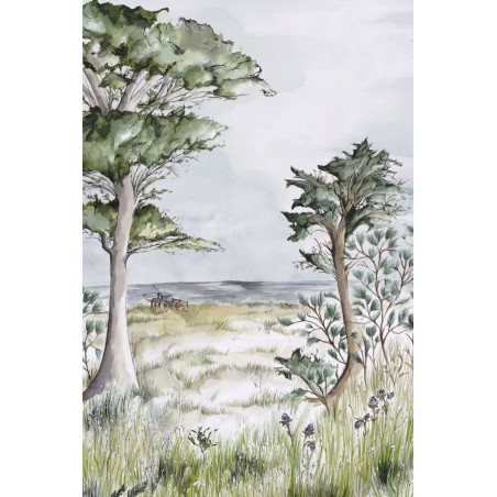 Une escapade au bord de l'océan, la côte atlantique, Pornic et les vents. Ici, des herbes folles. Là, le sable et les pins parasol. Au loin, une cabane de pêcheur sur pilotis, reliée à la terre par un ponton... Réalisé avec des encres colorées, ce tableau évocateur de Pornic retranscrit merveilleusement l'atmosphère des lieux.