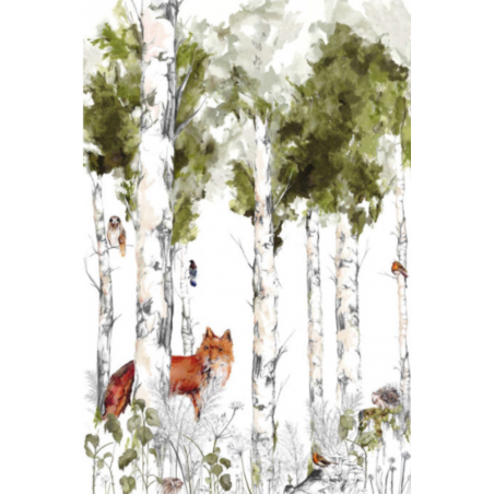 Inspirée par la divinité protectrice des arbres, le panoramique Sylvania nous propose une superbe représentation de la forêt. Une version aquarellée, dans laquelle le renard et le feuillage des bouleaux se détachent de l'ensemble du tableau. Ce dessin a été entièrement peint à la main à l'aquarelle et au pastel par l'une de nos stylistes.