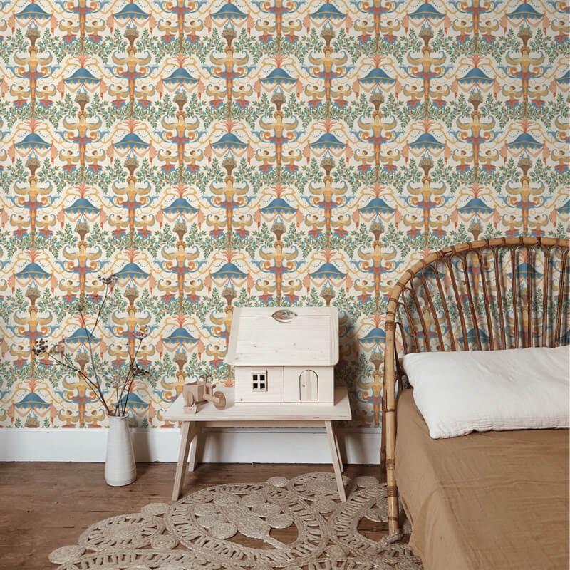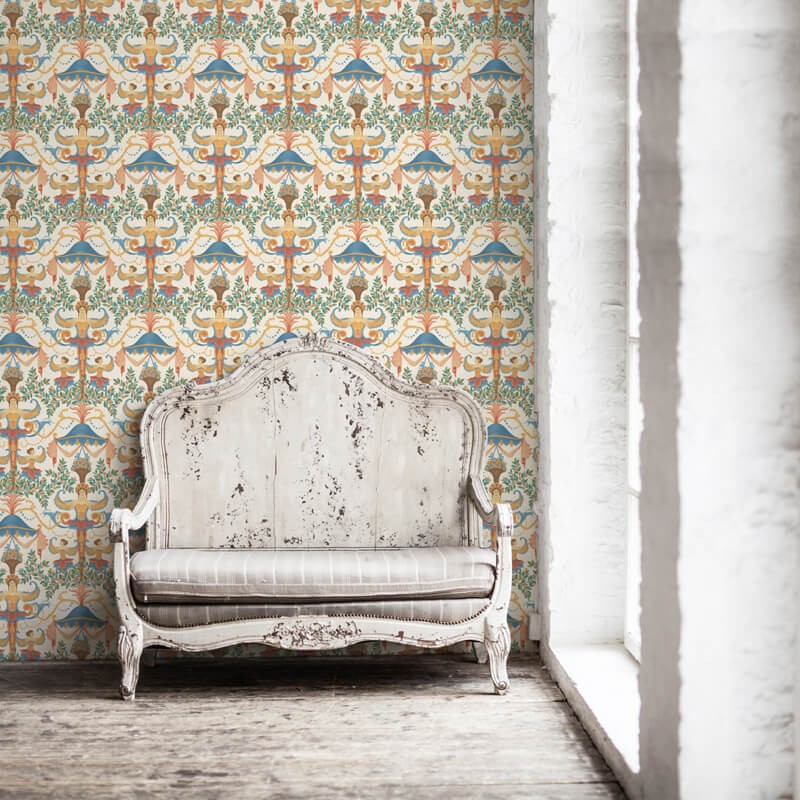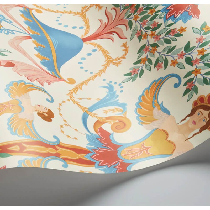 Les artistes de Cole & Son se sont inspirés pour Chamber Angels de la structure unique de style carrousel que l'on trouve au plafond de la Presence Chamber, qui fait partie des appartements d'État du roi au palais de Kensington. Conçu à l'origine par William Kent, l'un des noms les plus influents du design du début du XVIIIe siècle, le style festif du motif évoque l'essence de la pièce, étant un lieu où le roi recevait et recevait des courtisans, des ministres et des ambassadeurs étrangers. Des figures dansantes ont été combinées avec un feuillage délicat et les fruits mûrs, autrefois trouvés dans l'orangerie du palais de Kensington, créent un design décoratif décadent.