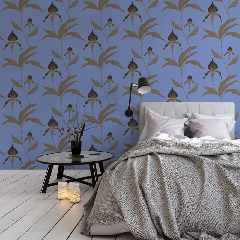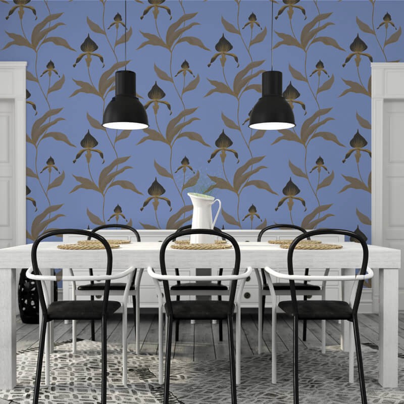 | Couleur Papier Peint | Charcoal, Taupe & Metallic Gold on Hyacinth Blue |
