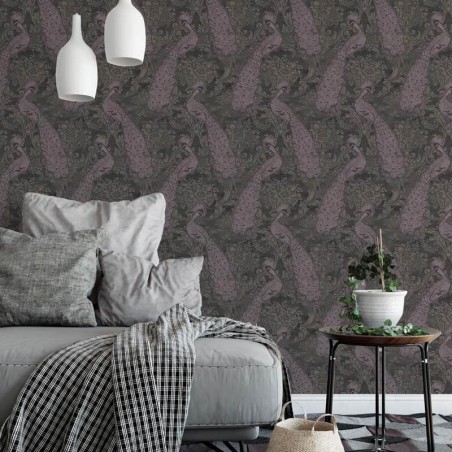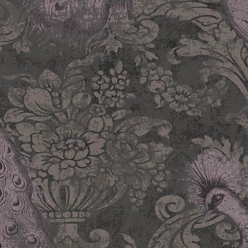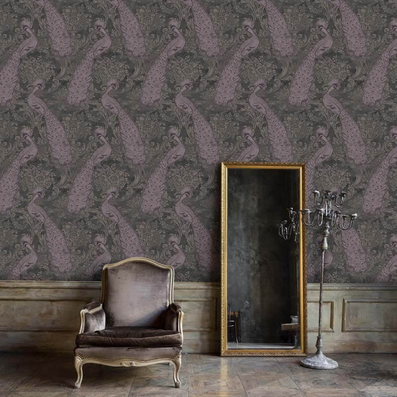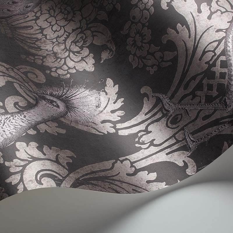Byron est un élégant papier peint damassé avec des paons dorés dans des teintes minérales précieuses de pétrole, d'or, de sarcelle, d'argent et de charbon de bois. Inspiré par l'amour victorien des oiseaux d'ornement, l'imprimé est opulent et exotique avec ses riches tons de gris lilas, de gilet et d'olive.