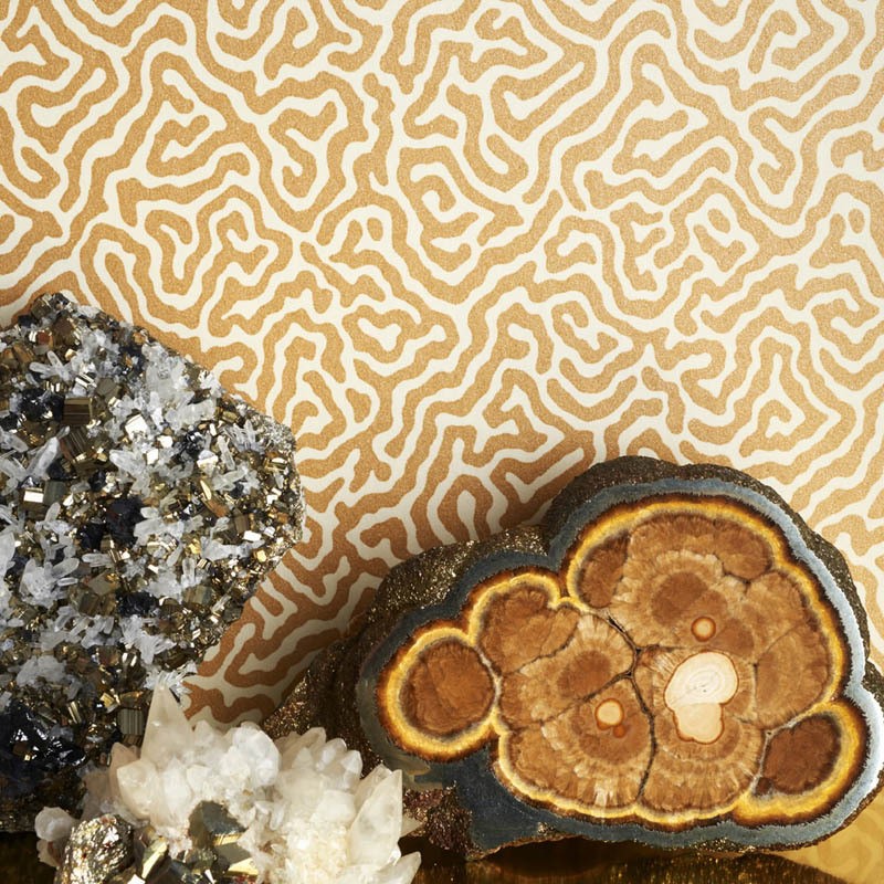 Inspiré par les raretés et les objets d'art du monde naturel, Curio est un coffret collector de surfacesminérales chatoyantes, de textures de grain de bois, de coraux marins et de pierres précieuses traduits en luxueux papiers peints intissés.