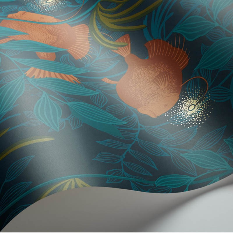 Ce charmant design met en scène un couple de baudroies énigmatiques scintillant dans un paysage onirique de plantes et de vrilles sous-marines. Présenté dans des palettes d'olive et de rose doux, de neutre et de dorure subtils, de vert et d'orange saisissants, d'indigo et de jaune profonds, Nautilus, comme son homonyme, révèle un monde sous-marin magique dans un monde.