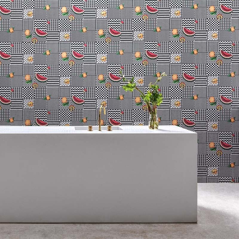 Chacun des coloris de Frutto e Geometrico offre une variation de cette combinaison ou structure unique et de cette forme organique. Choisissez entre un échiquier noir et blanc, aux pastels menthe les plus doux, ou un gris lilas crépusculaire.