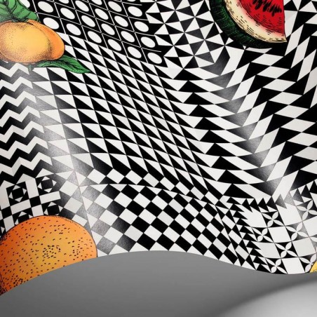 Les lignes graphiques nettes insufflent à ce papier peint saisissant le style signature inimitable et l'allure intemporelle de Fornasetti. L'effet trompe l'oeil accentue le contraste entre la géométrie rigoureuse de la base et les formes organiques des différents fruits que l'on trouve dans la nature.