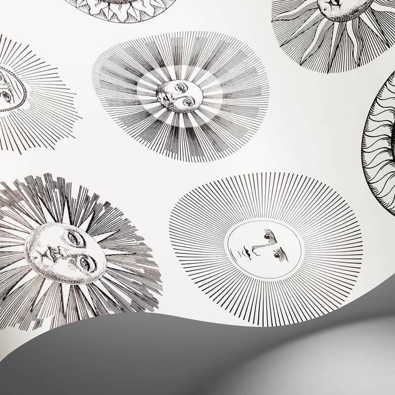 Classique du portfolio de l'Atelier, le soleil occupe une place privilégiée dans le répertoire des formes naturelles de Fornasetti et est l'un des motifs majeurs de l'univers visuel de l'Atelier. Une prédilection en partie justifiée par le fait que pendant des années, au début des années 1940, à la demande de Gio Ponti, Piero Fornasetti a conçu des almanachs sur un thème lunaire pour être offerts en cadeau de Noël.