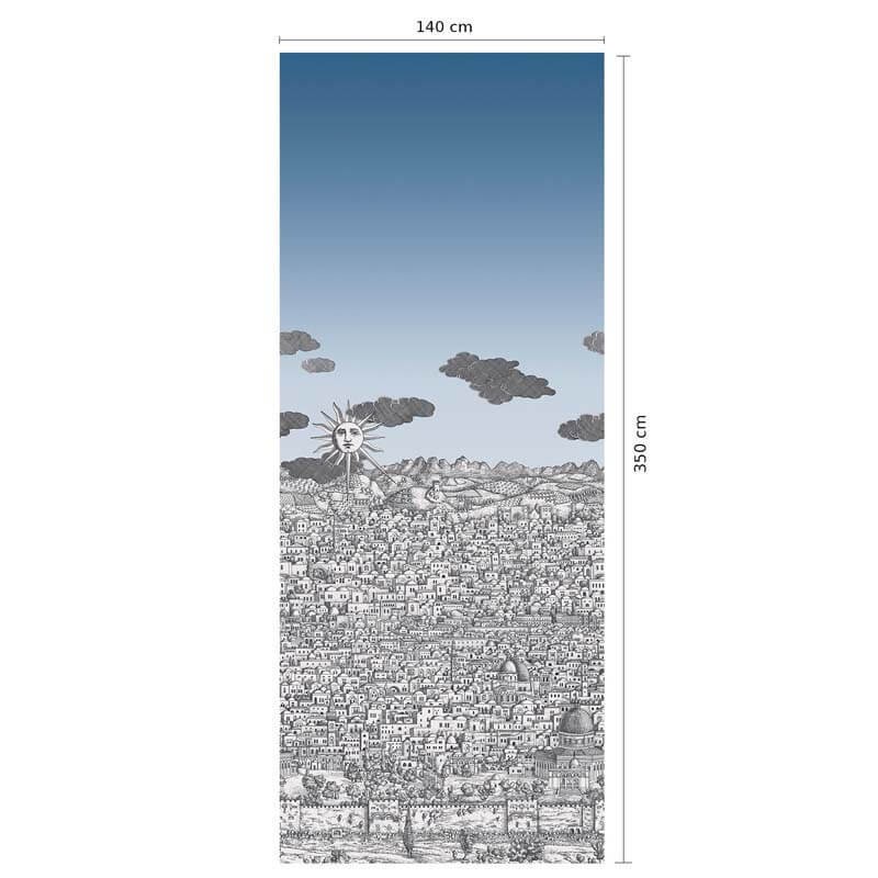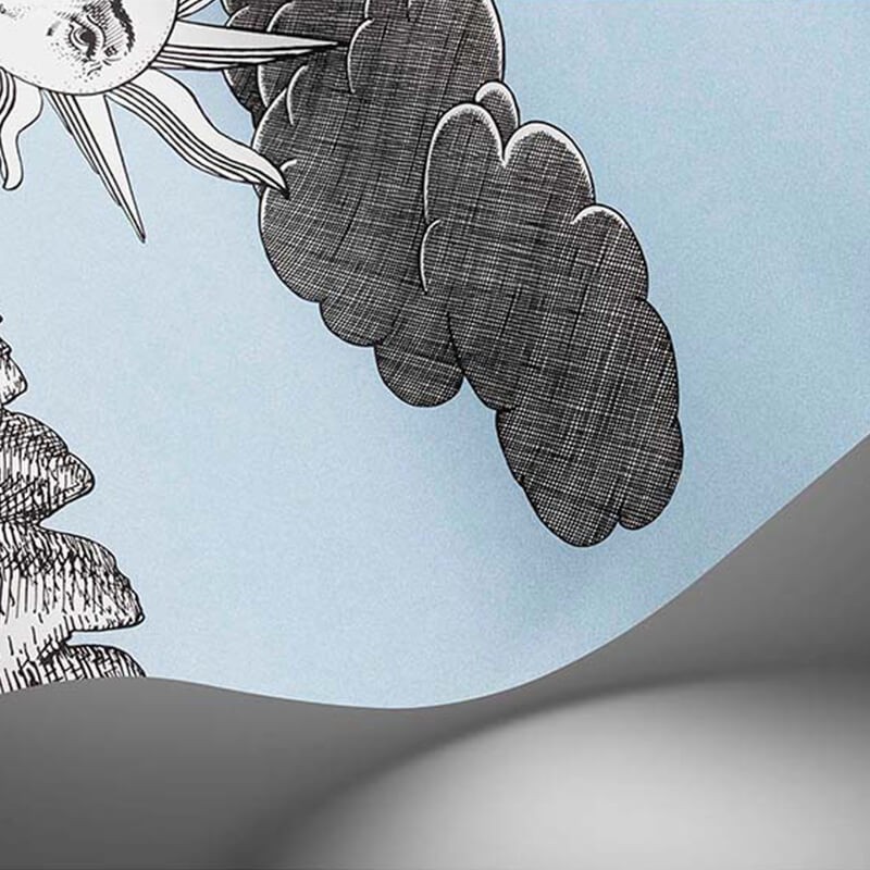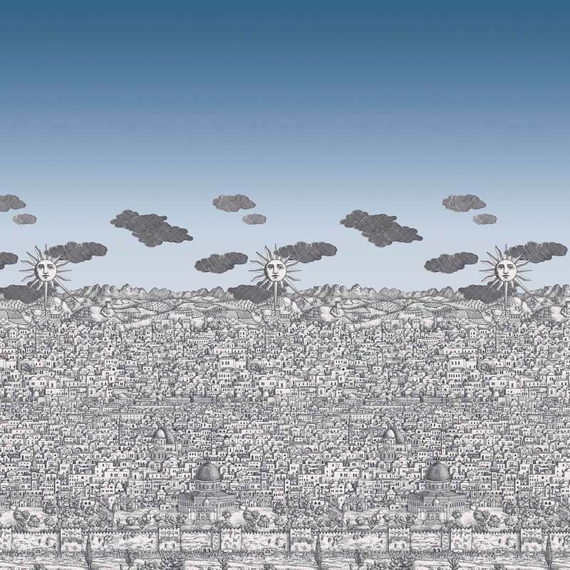 Une fuite au-delà des limites de l'imagination conduit Fornasetti dans une Jérusalem enchantée et hypnotique. De multiples points de vue se chevauchent, avec différents styles architecturaux qui se poursuivent dans un motif continu. La ligne noire précise des bâtiments interprète une imagination sans limite, créant une texture intrigante. Le premier voyage onirique de ce dessin a eu lieu sur le papier peint " Gerusalemme " conçu par Piero Fornasetti pour le hall d'entrée de sa résidence milanaise à la fin des années 1940. Il a ensuite été étendu aux plateaux, aux porte-revues,aux lampes et aux meubles. Un soleil brillant, perçant à travers les nuages, a été ajouté au paysage au début des années 90, ajoutant un autre élément fantaisiste à cette impression tentaculaire.