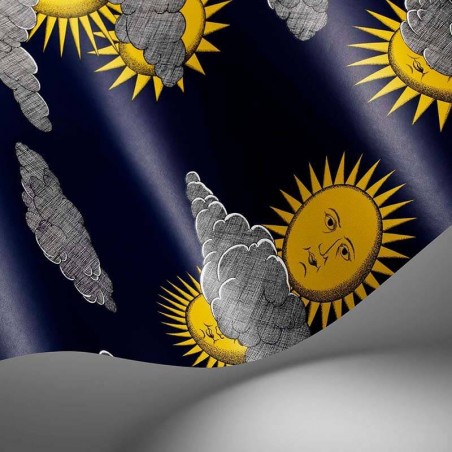 L'inspiration de cet imprimé est " Sole di Capri ", un design créé par Piero Fornasetti dans les années 50. Piero Fornasetti a longtemps eu une passion pour Capri et a créé ce design emblématique à partir de son imagination, avant même d'avoir visité l'île légendaire. Piero a finalement emmené la famille là-bas en vacances et, dans les années 1960, a également ouvert une boutique temporaire Fornasetti sur l'île. L'estampe originale est une combinaison de soleils personnifiés et d'architecture stylisée, tous deux typiques de Fornasetti. L'idée d'associer des soleils et des nuages personnifiés apparaît pour la première fois dans une esquisse pour un foulard que Piero a dessiné en 1950. Il s'agit désormais d'un imprimé fantaisiste sur toute la surface, apportant une bizarrerie unique à un intérieur.