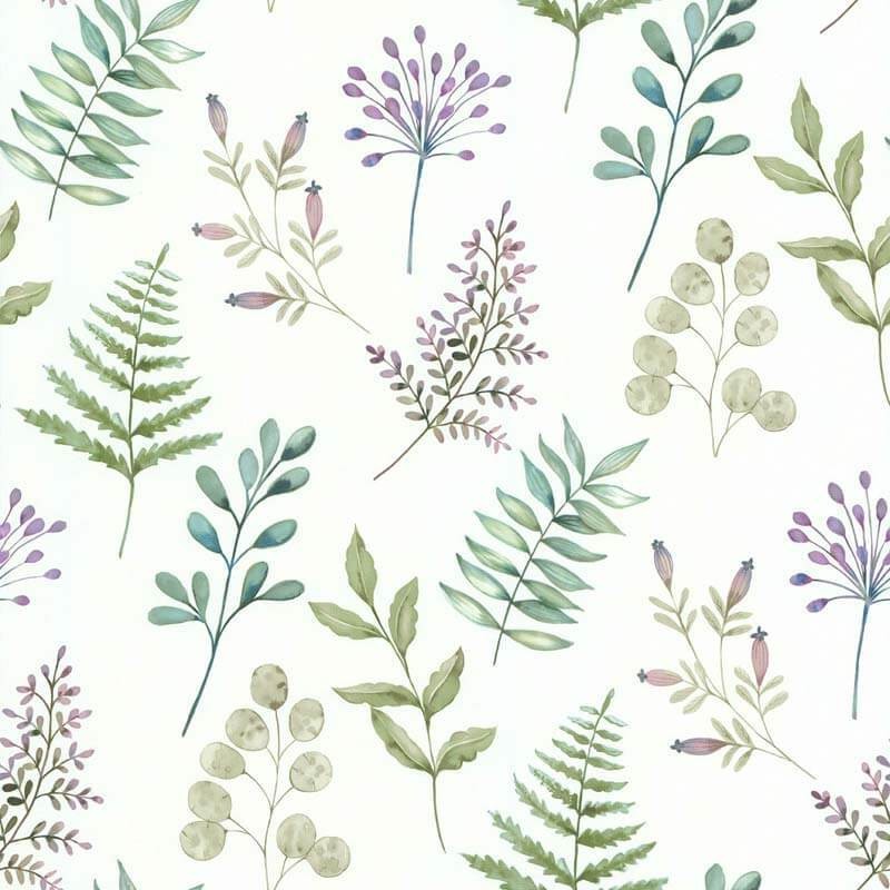 Papier peint motif herbier dans les tons vert et mauve. Il apportera une ambiance naturelle et apaisante à votre intérieur. Inspiré par la beauté des plantes et des fleurs, ce papier peint saura créer un espace à la fois calme et rafraîchissant.
