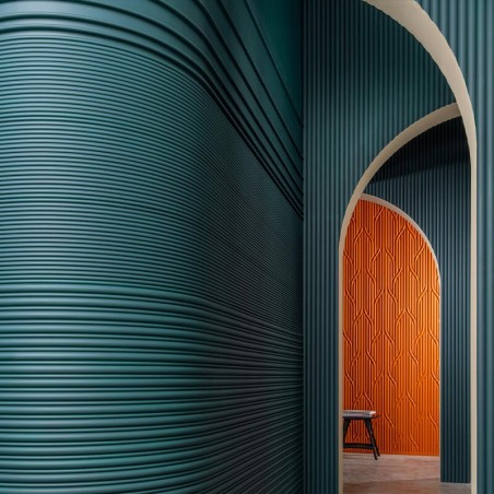 WX211 Flute est un nouveau panneau mural exceptionnel. Placés à l'horizontale, les panneaux créent un effet dynamique, semblable à une vague. L'alternance de petites et de grandes bosses crée un jeu d'ombre et de lumière qui donne de la profondeur et du mouvement à la pièce. Lorsqu'ils sont posés verticalement, les panneaux offrent un sentiment d'élégance structurée, accentuant la hauteur de la pièce tout en créant une toile de fond visuellement intrigante.