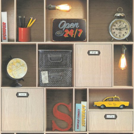 Plongez dans l'ambiance authentique de New York avec le papier peint intissé étagère Vintage de la collection Les Aventures par Lutèce. Ce modèle unique vous transporte dans un intérieur new-yorkais rétro, où chaque objet raconte une histoire. Grâce à ce trompe-l'oeil réaliste, vous découvrirez une étagère en bois regorgeant de souvenirs vintage : un taxi jaune miniature, un réveil rétro, et des pancartes de diner américain. Chaque détail soigneusement conçu apportera une touche chaleureuse et intemporelle à vos murs.