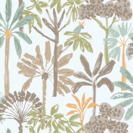 Un motif végétal joyeux : Le dessin enfantin et les couleurs vives de ce papier peint créent une ambiance ludique et pleine de vie. L'ondulation des frondes des palmiers et les perruches qui les décorent apportent une touche de fraîcheur et de gaieté à votre intérieur.