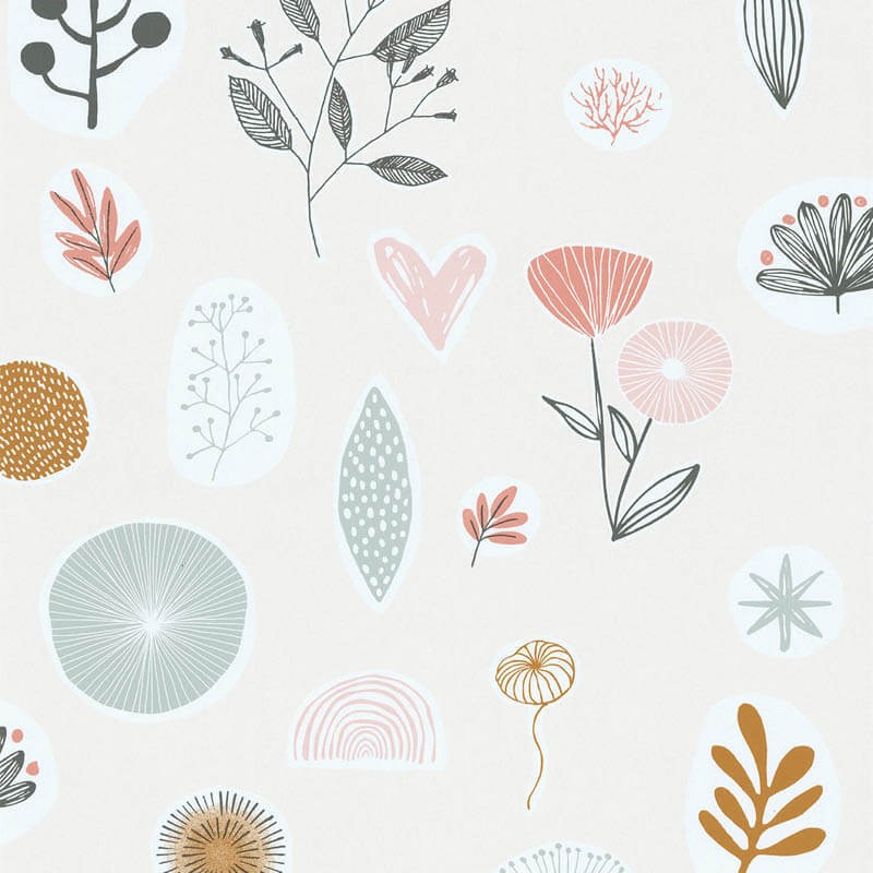 Design floral doux et onirique : Les motifs floraux, inspirés de dessins enfantins, apportent une touche de naïveté et de fraîcheur. Les couleurs écru, rose gris et ocre se marient harmonieusement pour créer un environnement apaisant et élégant.