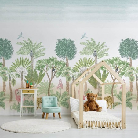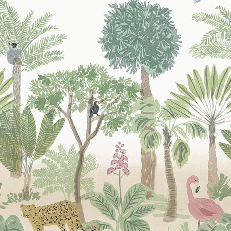 Une jungle onirique et ludique : Flamants roses, léopards, et singes prennent vie dans ce décor naïf et épuré, inspiré des dessins d'enfants. Ce motif vibrant et plein de charme crée une ambiance à la fois ludique et paisible, parfaite pour stimuler l'imagination des petits et favoriser la rêverie.
