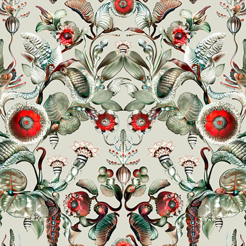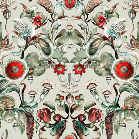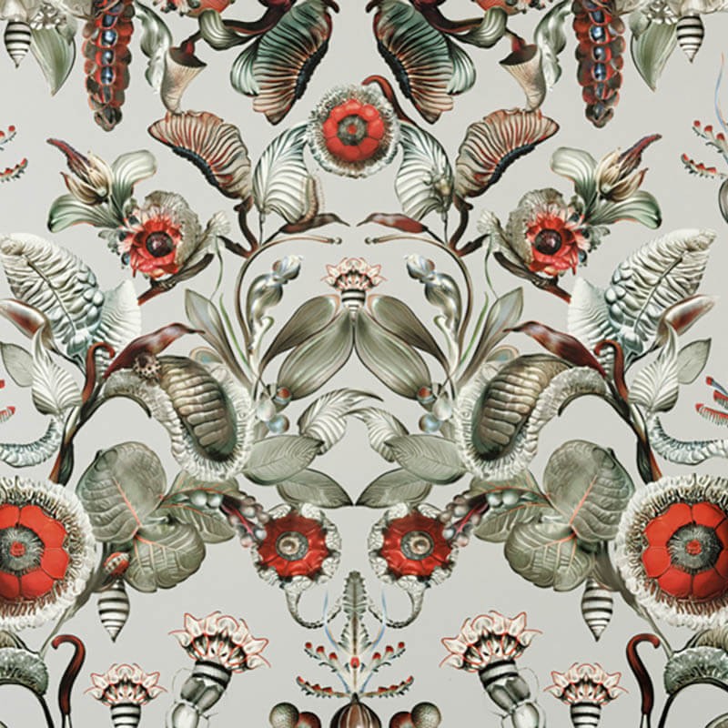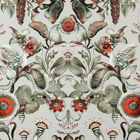 Le revêtement mural Coccinella Bella s'inspire du large éventail de fleurs et de feuilles qui constituent le foyer des coccinelles. Le dessin représente un motif floral de type jacobéen multicolore, imprimé sur un textile doux.