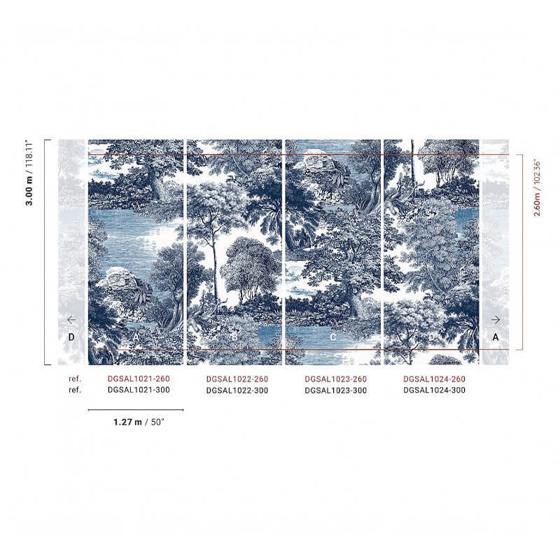 Chaque panoramique Masureel est accompagné d'une photo détaillant tous les lés individuellement, avec les références correspondantes, pour vous aider à identifier facilement les différentes parties du décor. Vous trouverez ci dessous les liens des autres lés correspondants à ce panoramique.