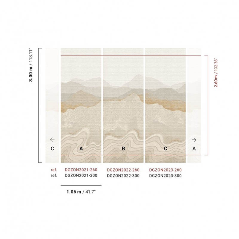Ce revêtement mural panoramique évoque une chaîne de montagnes brumeuse et lointaine, avec une finesse de dessin qui lui confère à la fois modernité et poésie intemporelle. Le jeu subtil entre force graphique et délicatesse des teintes crée une ambiance apaisante et sophistiquée, idéale pour sublimer un salon, une chambre ou un espace de réception.