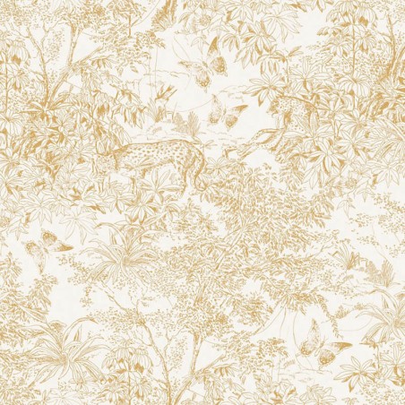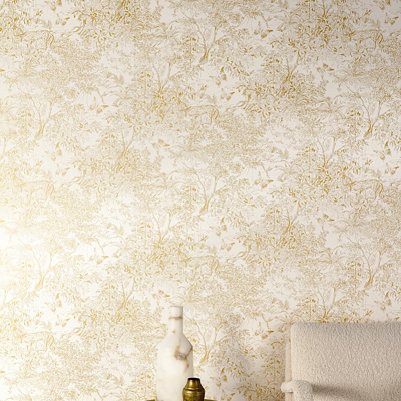 La surface du revêtement mural se pare d'un foisonnement de feuillages luxuriants, de fleurs délicates et de papillons vibrants qui virevoltent au coeur d'un entrelacs de branches. En observant de plus près, on distingue l'ombre discrète de léopards furtifs qui se fondent dans la scène, apportant une touche mystérieuse et sauvage à la composition.