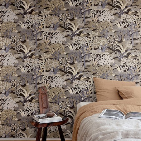 Plongez dans un univers luxuriant avec le papier peint Fabulo de la collection Amazone par Khrôma by Masureel. Ce revêtement mural intissé présente un motif détaillé représentant une scène dense de végétation, avec des arbres majestueux et un feuillage abondant, créant une atmosphère immersive et raffinée.