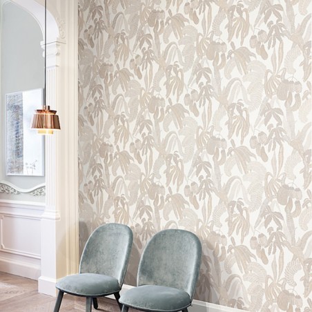 Le papier peint Ninfa s'accorde parfaitement avec des matières naturelles comme le bois clair, le rotin, le lin ou la céramique brute. Pour une ambiance encore plus immersive, mariez-le avec des plantes d'intérieur, des rideaux fluides et des luminaires organiques.