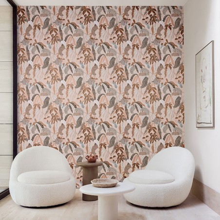 Le papier peint Ninfa s'accorde parfaitement avec des matières naturelles comme le bois clair, le rotin, le lin ou la céramique brute. Pour une ambiance encore plus immersive, mariez-le avec des plantes d'intérieur, des rideaux fluides et des luminaires organiques.