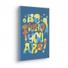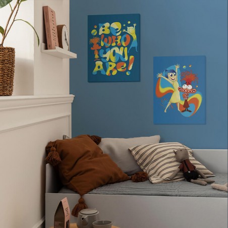La toile imprimée présente un design coloré et inspirant avec l'inscription " Be Who You Are ! " en grandes lettres courbes. Les lettres sont conçues dans des tons vifs de jaune, de bleu et d'orange. Des personnages du film de Pixar " Tout est à l'envers " (comme la joie et le chagrin) sont intégrés de manière ludique dans le design. Le fond bleu souligne le message d'individualité et de positivité.