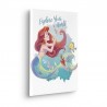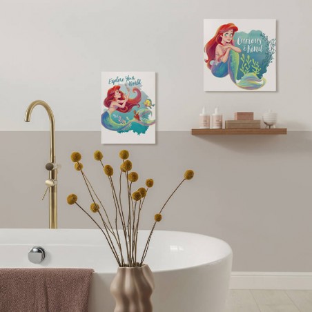 La toile imprimée représente Ariel dans une pose élégante. Elle regarde vers le haut, tandis que ses cheveux roux et sa nageoire de sirène irisée sont représentés avec fluidité. À ses côtés, on peut voir Fabius et Sebastian. L'inscription " Explore Your World " se trouve en haut et confère à l'image un message inspirant. L'arrière-plan est dans des tons bleus et pastels doux, ce qui crée une atmosphère maritime et rêveuse.