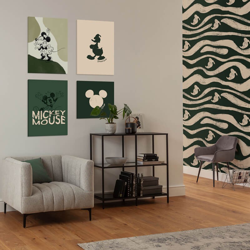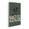 La toile imprimée représente Mickey Mouse dans un design stylisé et moderne. La silhouette de Mickey est suggérée dans un ton foncé, tandis que l'inscription " MICKEY MOUSE " en grandes lettres courbes domine la partie inférieure du tableau. L'arrière-plan est vert foncé et confère au design un aspect élégant et rétro.
