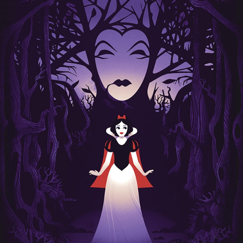 Un conte de fées magiquement sombre prend vie ! Le posters d'art montre Blanche-Neige dans une forêt mystérieuse et sombre, tandis qu'en arrière-plan, le visage menaçant de la méchante reine émerge des branches des arbres. Les couleurs contrastées dans les tons violets et noirs, combinées à la robe éclatante de Blanche-Neige, créent une atmosphère unique. Parfait pour les fans de Disney qui aiment le côté mystique et dramatique du monde des contes de fées classiques.