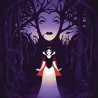 Blanche-Neige, dans sa robe emblématique, a une posture droite et regarde vers l'avant, son apparence semble à la fois innocente et courageuse. Dans la partie supérieure de l'image, le visage de la méchante reine apparaît dans une représentation fantomatique qui s'intègre parfaitement dans les branches de la forêt. L'image combine l'esthétique des contes de fées avec une touche de noirceur et de drame.