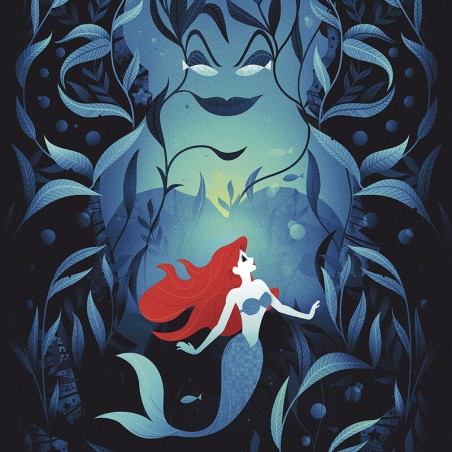 Plonge dans les profondeurs du monde marin avec Arielle, la petite sirène. Elle se montre ici dans une scène à couper le souffle, encadrée par des plantes sous-marines sombres. En arrière-plan se dresse la silhouette menaçante de la sorcière des mers Ursula, dont le regard renforce encore la tension de la scène. Les couleurs vives des cheveux d'Arielle et la douce lumière qui l'entoure forment un magnifique contraste avec le monde sous-marin sombre et mystérieux.
