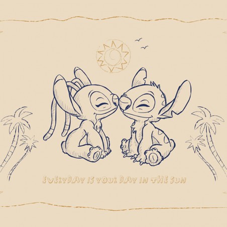 Un poster d'art plein de tendresse et de légèreté tropicale. Stitch et Angel partagent un moment d'amour sous un soleil radieux, encadré de palmiers et de lignes douces qui donnent un sentiment de vacances et de romantisme. L'inscription " Forever Is Our Love in the Sun " - " Pour toujours, notre amour est au soleil " - souligne la magie de leur complicité et fait de ce tableau un bijou qui réchauffe le coeur et s'adapte à tous les murs.
