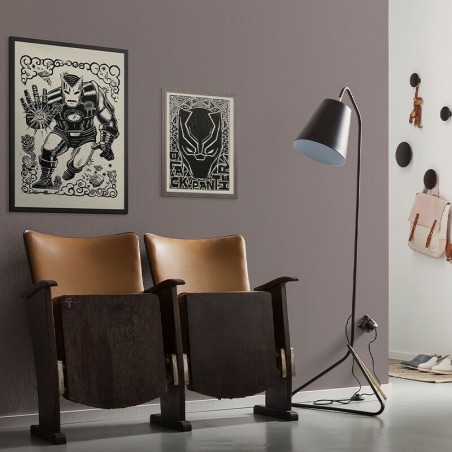 Cette affiche est une représentation stylisée, façon linogravure, d'Iron Man, l'un des super-héros les plus connus de l'univers Marvel. L'illustration en noir et blanc rappelle les techniques d'impression traditionnelles et combine le caractère emblématique avec un air artistique vintage.