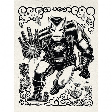 Cette affiche est une représentation stylisée, façon linogravure, d'Iron Man, l'un des super-héros les plus connus de l'univers Marvel. L'illustration en noir et blanc rappelle les techniques d'impression traditionnelles et combine le caractère emblématique avec un air artistique vintage.