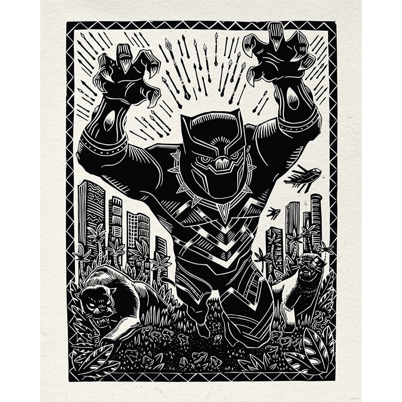 Un portrait puissant de Black Panther, le protecteur du Wakanda. Celui-ci est ici représenté dans un style dynamique, proche de la linogravure, qui allie force et élégance. Les griffes levées, il s'élance hors de la scène, accompagné d'un arrière-plan riche en détails. Le contraste entre le noir et le blanc confère au motif une esthétique intemporelle, tandis que la composition dynamique capture l'énergie et le courage du roi du Wakanda.