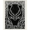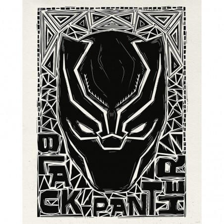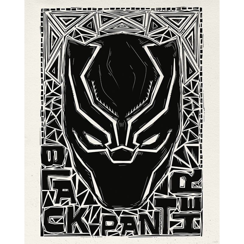 L'image montre le casque de Black Panther dans un style de linogravure, entouré de motifs géométriques et de l'inscription " Black Panther ". Il allie la tradition à l'esthétique moderne des super-héros.